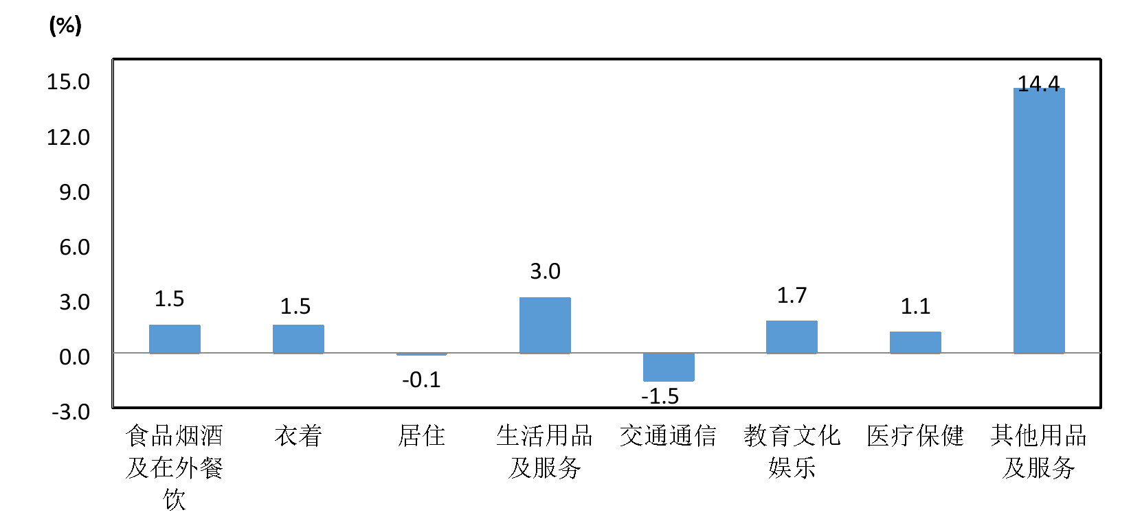 其他七大类价格同比五涨二降。其中,其他用品及服务、生活用品及服务、教育文化娱乐、衣着、医疗保健价格分别上涨14.4%、3.0%、1.7%、1.5%和1.1%;交通通信和居住价格分别下降1.5%和0.1%。