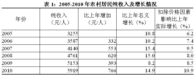 “十一五”期间,农村居民人均纯收入由2005年的3255元提高到2010年的5919元,增加2664元,名义增长81.8%,年均增长12.7%;扣除价格因素后,实际年均增长8.9%。比“十五”期间农村居民收入年均实际增长速度高3.6个百分点。